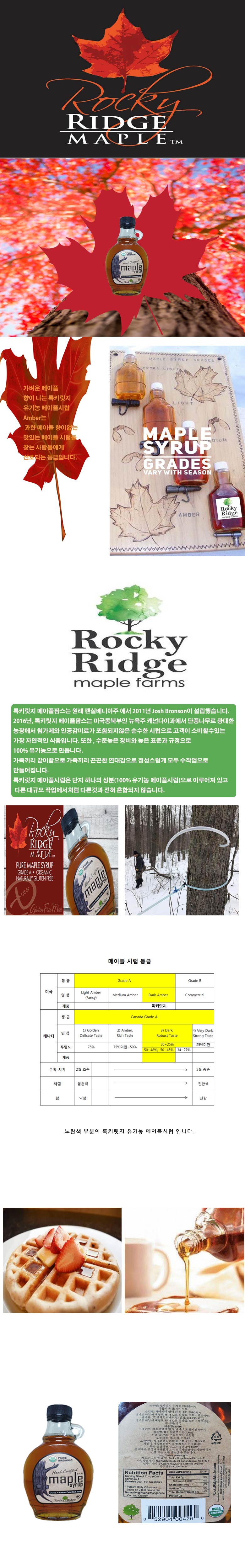 록키릿지 메이플시럽은 단지 하나의 성분(100% 유기농 메이플시럽)으로 이루어져 있고 다른 대규모 작업에서 처럼 다른것과 전혀 혼합 되지 않습니다.