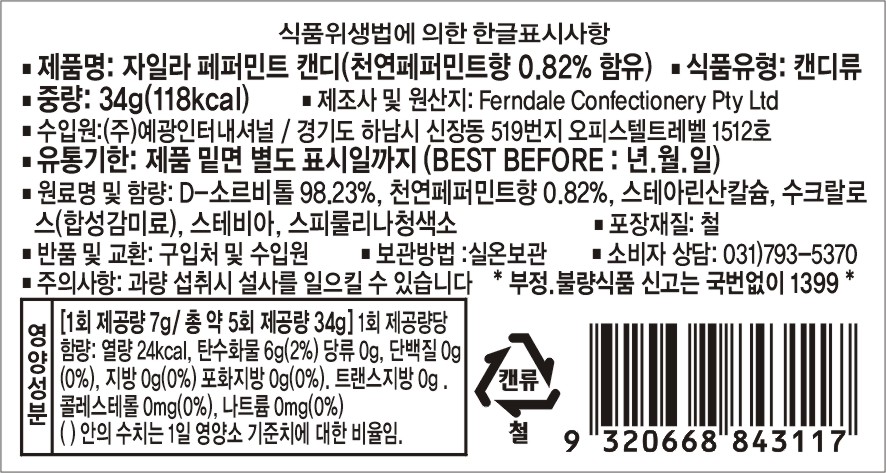 * 제품명: 자일라 페퍼민트캔디(천연페퍼민트향0.82%함유)