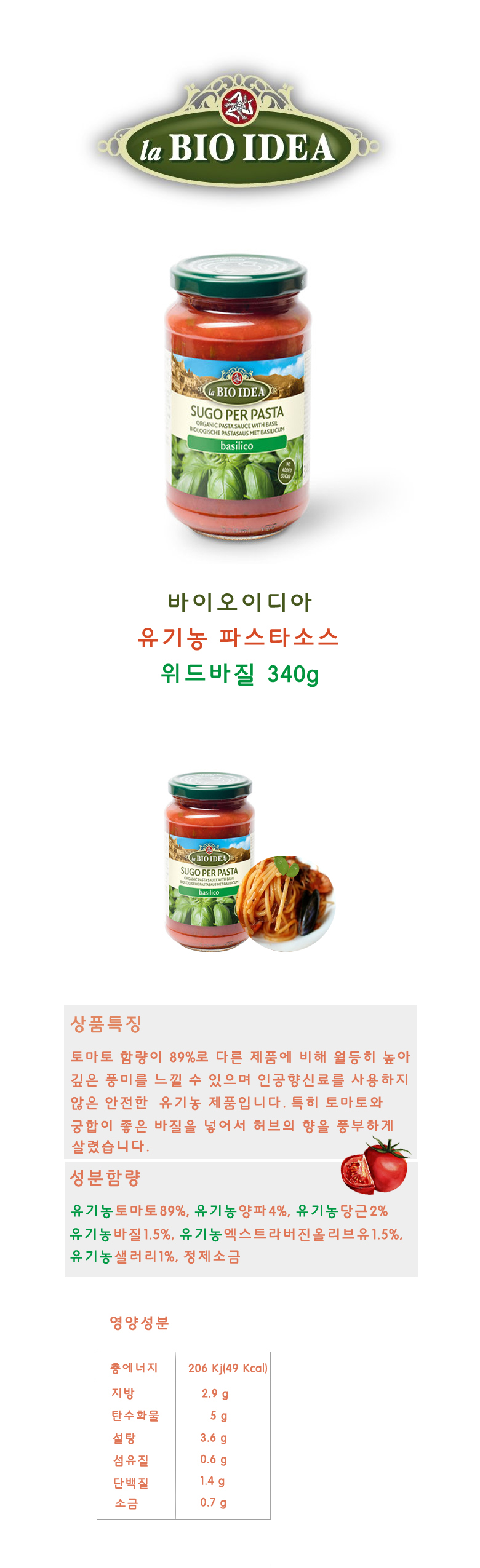 <바이오이디아 유기농 파스타소스 위드 바질 340g>