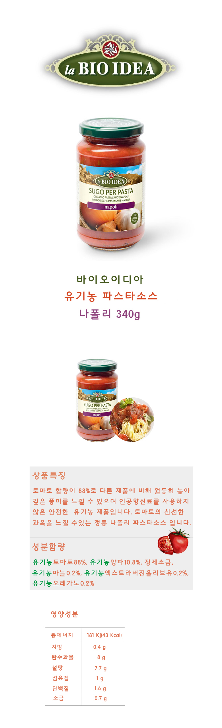 토마토 함량이 88%로 다른 제품에 비해 월등히 높아 깊은 풍미를 느낄 수 있으면 인공향신료를 사용하지 않은 안전한 유기농 제품 입니다. 토마토의 신선한 과육을 느낄 수 있는 정통 나폴리 파스타소스 입니다.