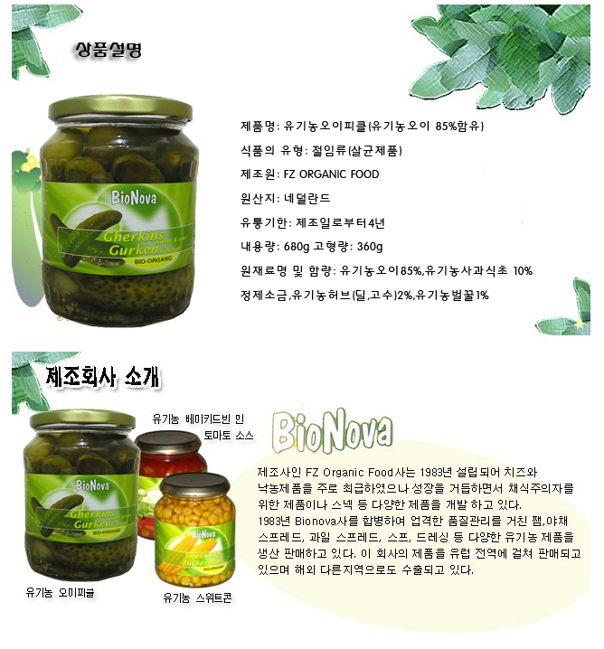 제품명: 유기농오이피클(유기농오이 85%함유)
