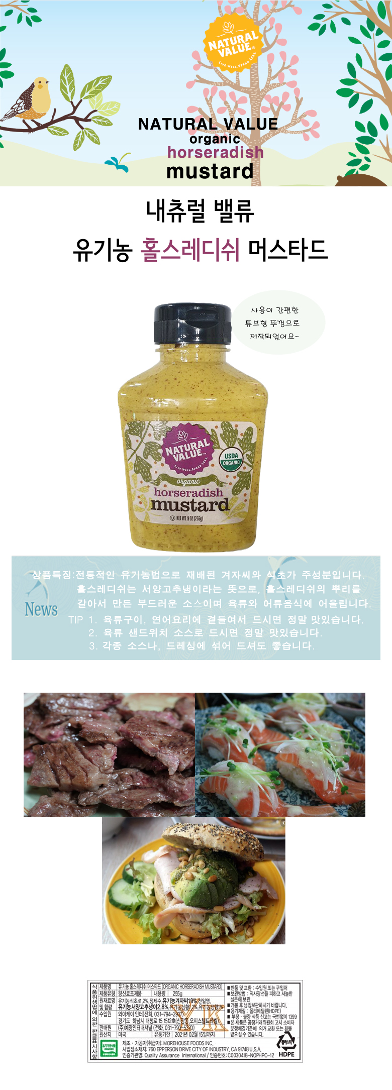 특징 : 전통적인 유기농법으로 재배된 겨자씨와 식초가 주성분 입니다.